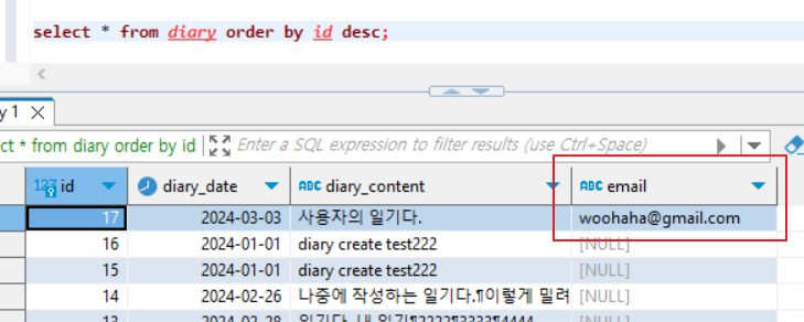 이제 로그인해서 일기를 작성하면 해당 일기 데이터의 email 에는 로그인한 사용자의 email 주소가 기록되게 되지.