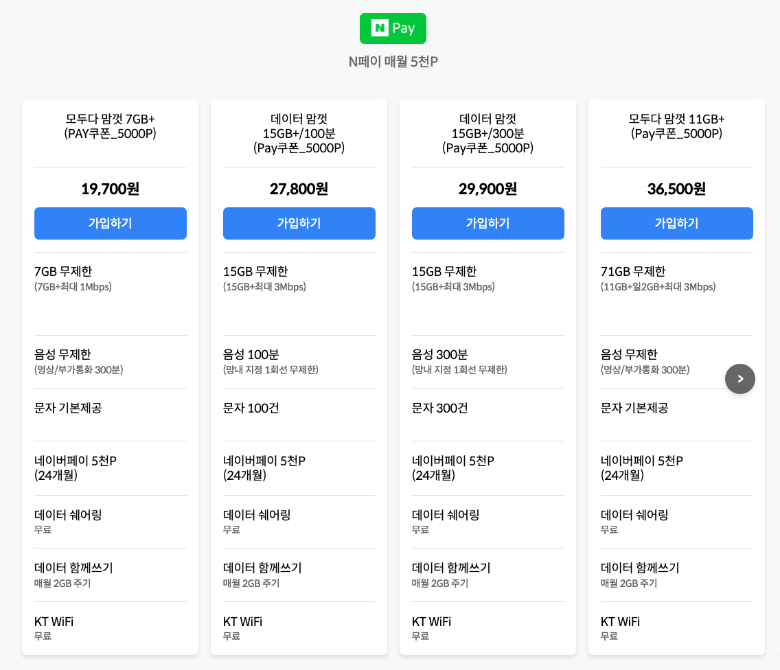 네이버페이 매달 5,000포인트를 얻을 수 있는 N페이 매월 5천P 제휴 요금제 중에서 15GB 무제한(속도제한시 3Mbps), 음성 100분, 문자 100건, 요금은 27,800원.