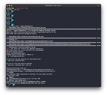 yarn 역시 brew 를 이용해서 설치할 수 있는데, 앞에서 이미 node 를 설치했기 때문에 yarn 을 설치할 때 node 가 설치되지 않도록 제외시켜야 한다.