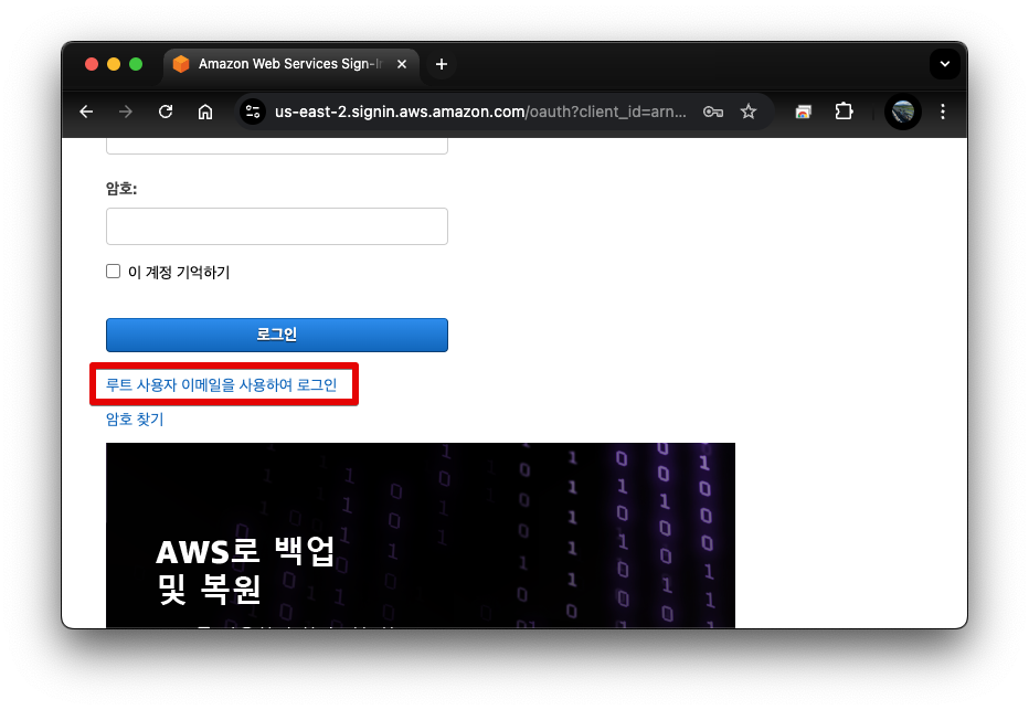 이동한 페이지를 아래로 스크롤해보면 "루트 사용자 이메일을 사용하여 로그인" 링크가 보인다.