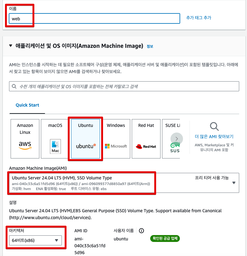 애플리케이션 및 OS 이미지(Amazon Machine Image) 항목에서는 Ubuntu 를 선택하였다.
