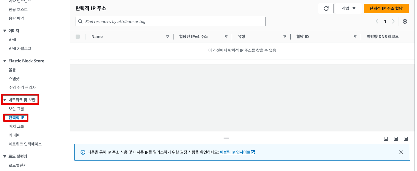 EC2 관리 메뉴 중 "네트워크 및 보안" 그룹에 "탄력적 IP" 메뉴가 있다.