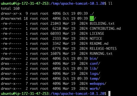 위 명령어가 수행되면 /tmp 디렉토리 하위에 apache-tomcat-10.1.20 이름의 디렉토리가 생성되고 그 안에 톰캣 서버 파일들이 압축 해제된다.