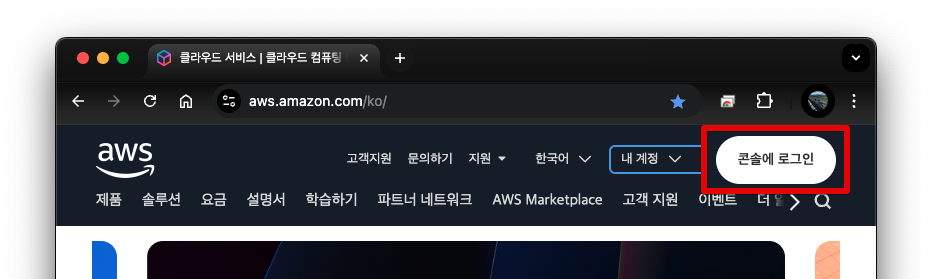 https://aws.amazon.com/ko/ 주소로 이동한 후 오른쪽 위의 "콘솔에 로그인" 버튼을 클릭한다.