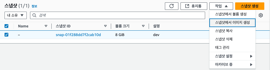 이 스냅샷을 새로운 인스턴스 생성에 사용할 수 있도록 AMI 화하는 단계는 아래와 같다.