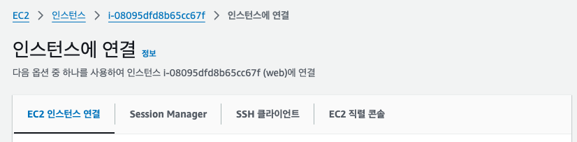인스턴스 ID 항목의 링크를 클릭하면 해당 인스턴스에 연결할 수 있는 "연결" 버튼이 보인다.
