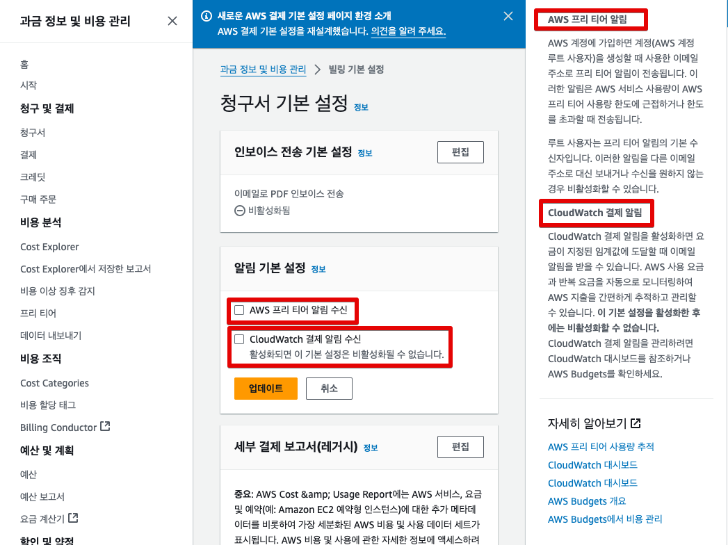 AWS 프리 티어 알림 수신과 CloudWatch 결제 알림 수신을 모두 체크하여 "업데이트"한다.