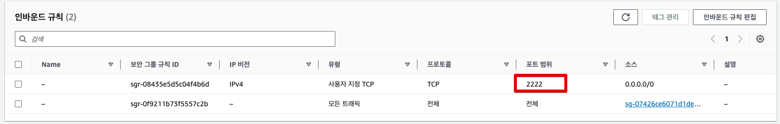 보안 그룹에서 인바운드 규칙에 넣어둔 22번 포트 허용 규칙을 2222번 포트 허용 규칙으로 수정해준다.