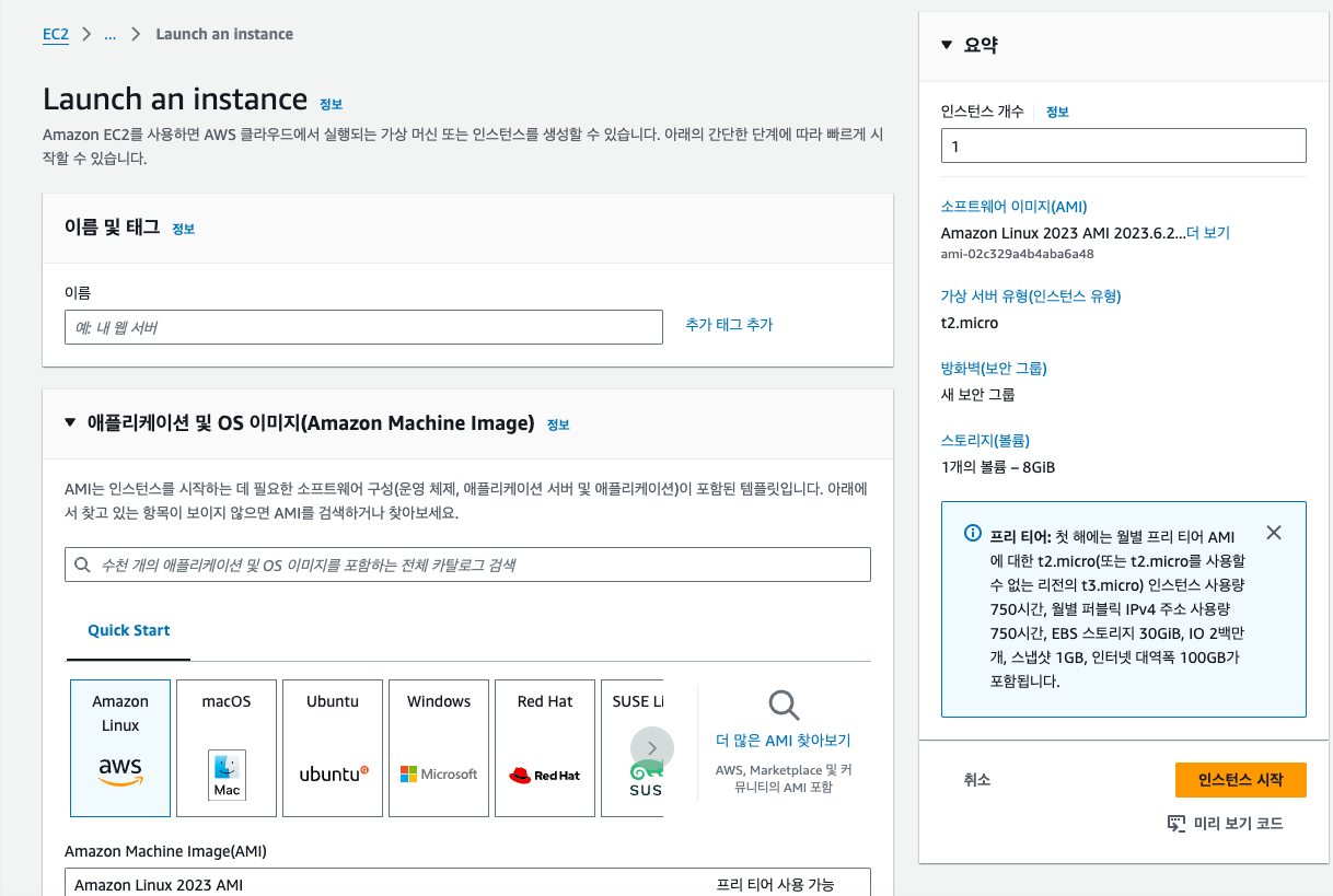 왼쪽 영역은 스크롤이 되면서 새로 만들 EC2 인스턴스의 다양한 속성을 설정할 수 있는 영역이다.