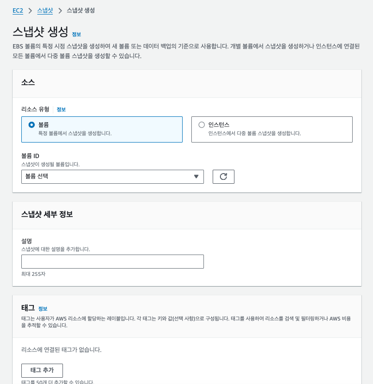 백업할 대상이 볼륨이면 볼륨을, 인스턴스면 인스턴스를 선택하면 되는데, 프리티어 EC2 를 사용하는 상황에서는 어느 것을 선택해도 결과가 동일할 수 밖에 없을 것 같다.