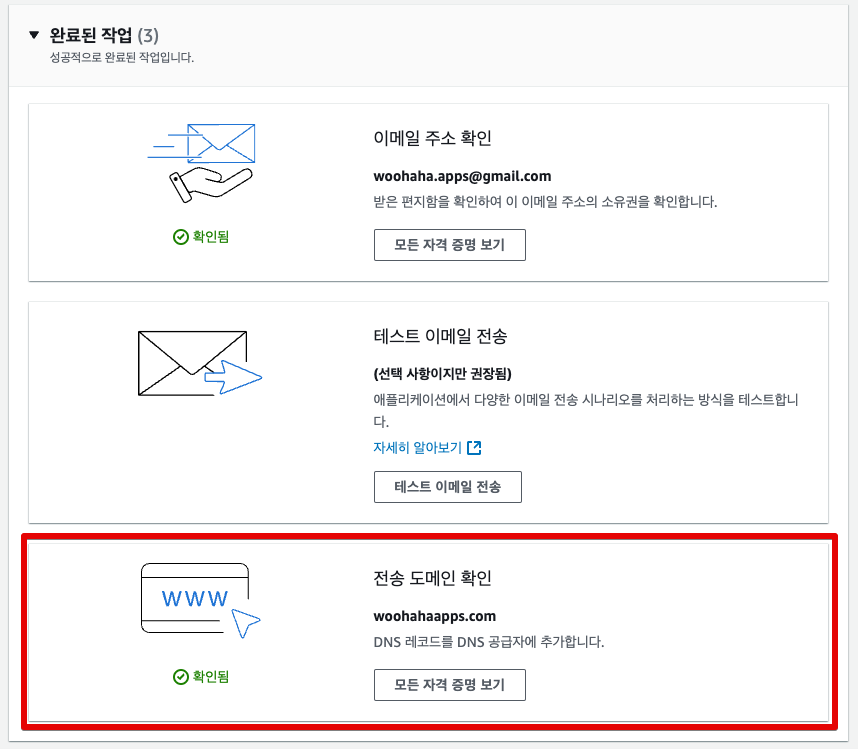 2024년 10월 30일 14:54 에 Amazon SES 페이지에 다시 들어가봤더니 완료된 작업 내역에 전송 도메인 확인 항목이 들어가 있었다.