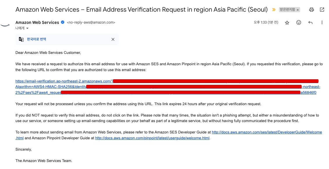 Amazon SES 를 시작하려면 확인 링크를 보낼 수 있는 이메일 주소의 검증이 확인되어야 한다.