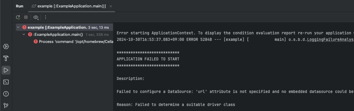 PostgreSQL, myBatis 관련 종속성이 정의가 되어 있으나 이와 관련된 설정이 정의되지 않았기 때문에 정상적으로 실행되지 못하는 것이다.