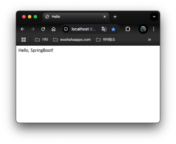 프로그램을 종료했다가 다시 실행한 후에 localhost:8080 으로 접속하면 아래와 같이 Hello, SpringBoot! 가 표시되는 결과를 맞이하게 된다.