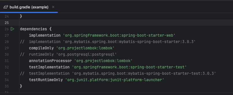 임시방편으로 build.gradle 파일에서 에러가 발생하는 종속성 항목을 주석처리한 후에 다시 실행시켜보자.