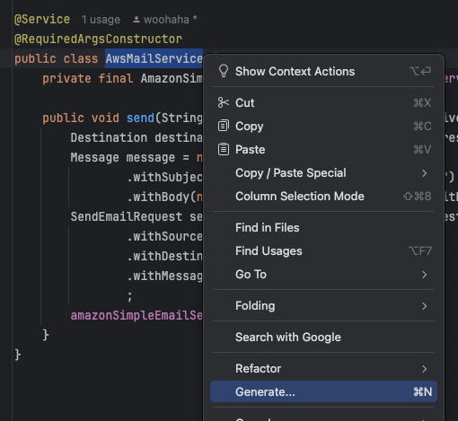 AwsMailService 가 선택된 상태에서 마우스 오른쪽 버튼을 누르고 Generate 메뉴를 선택한다.