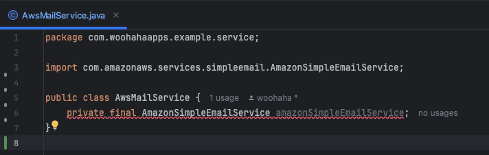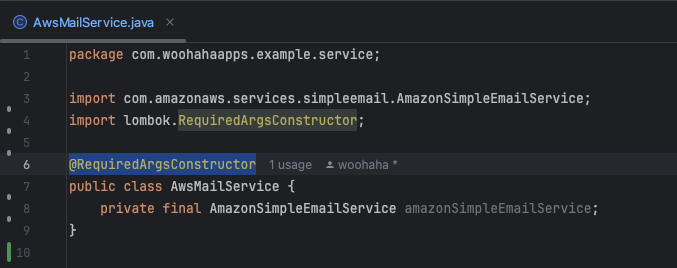 클래스의 private 멤버 변수로 AmazonSimpleEmailService 형 amazonSimpleEmailService 를 선언한다.