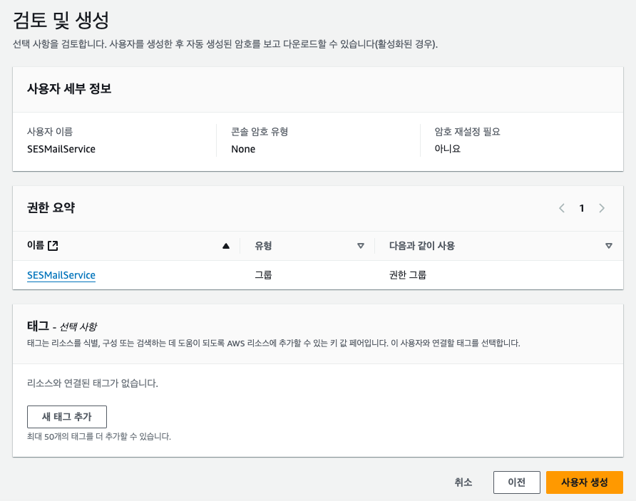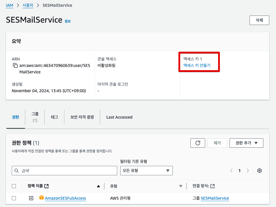 이제 사용자 그룹 목록에는 SESMailService 라는 이름의 그룹이 표시된다.