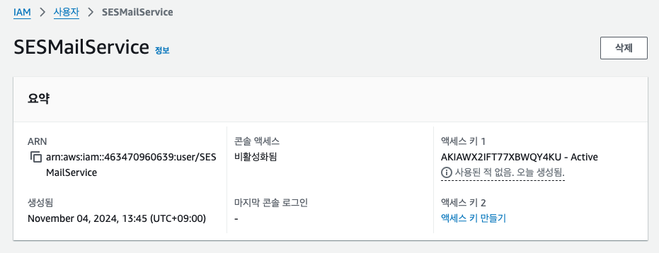사용자 화면으로 돌아오면 액세스 키 값은 화면에 표시가 된다.
