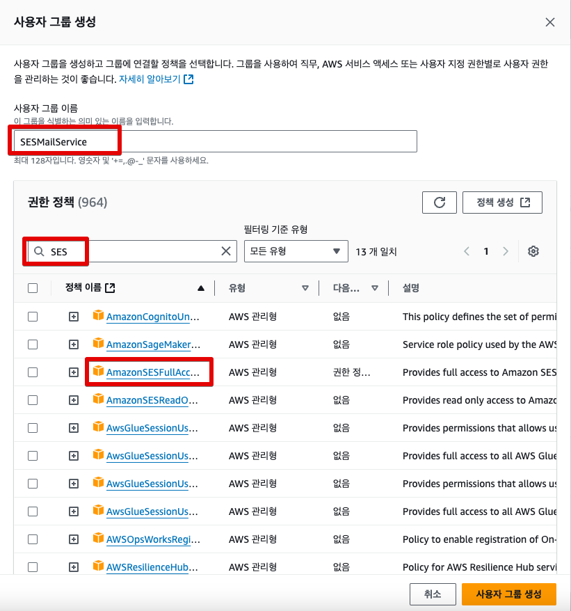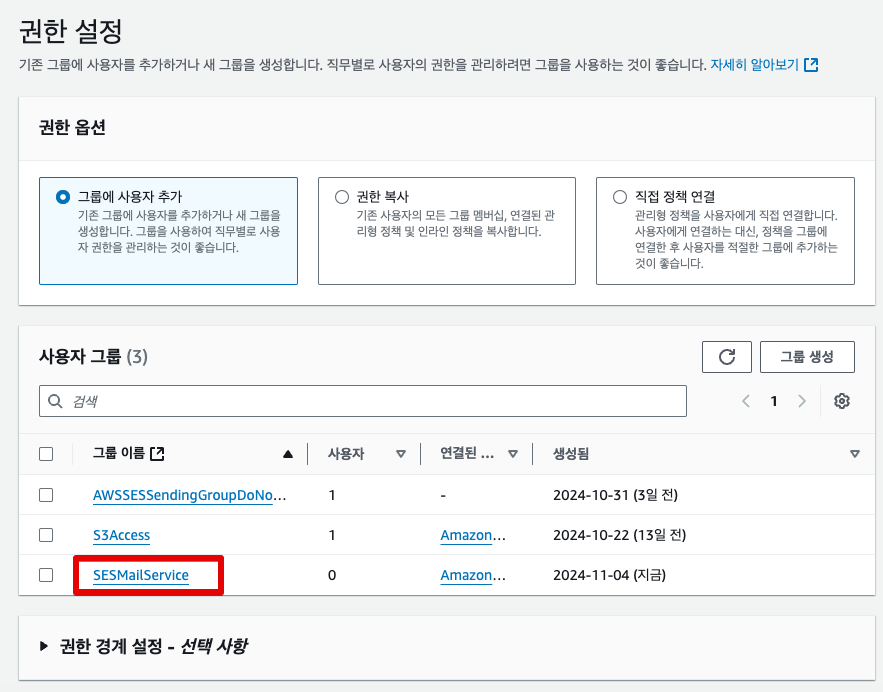 여기에서는 SESMailService 라는 이름의 권한 그룹을 생성하여 그 그룹에 포함시키는 과정을 설명한다.
