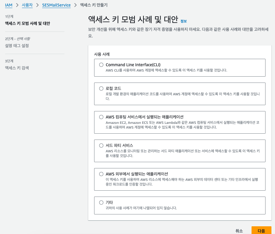 일단, 로컬 개발 환경에서 SES 서비스를 사용하여 이메일 발송을 테스트하는 과정이므로 두 번째 항목 로컬 코드를 선택한다.