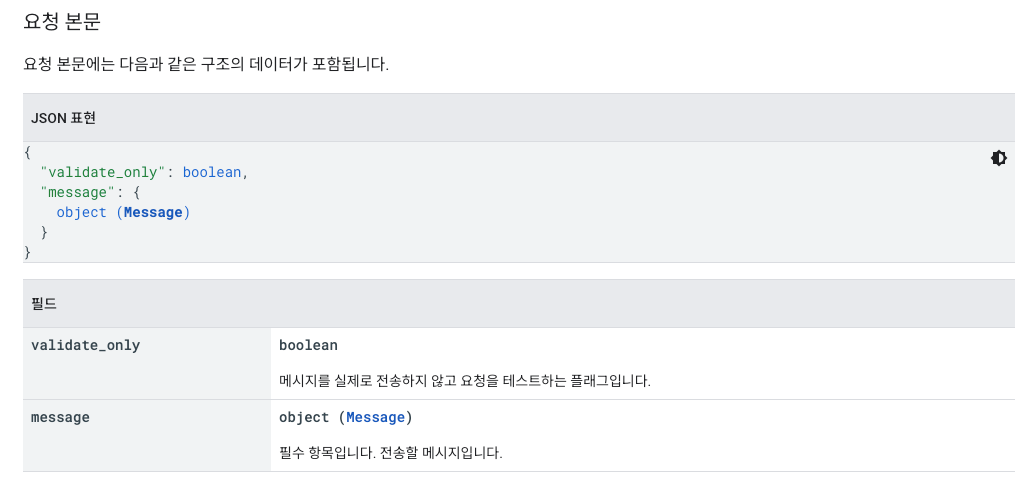 요청 본문 데이터 구조는 해당 문서 아래쪽에 다음과 같이 설명되고 있다.