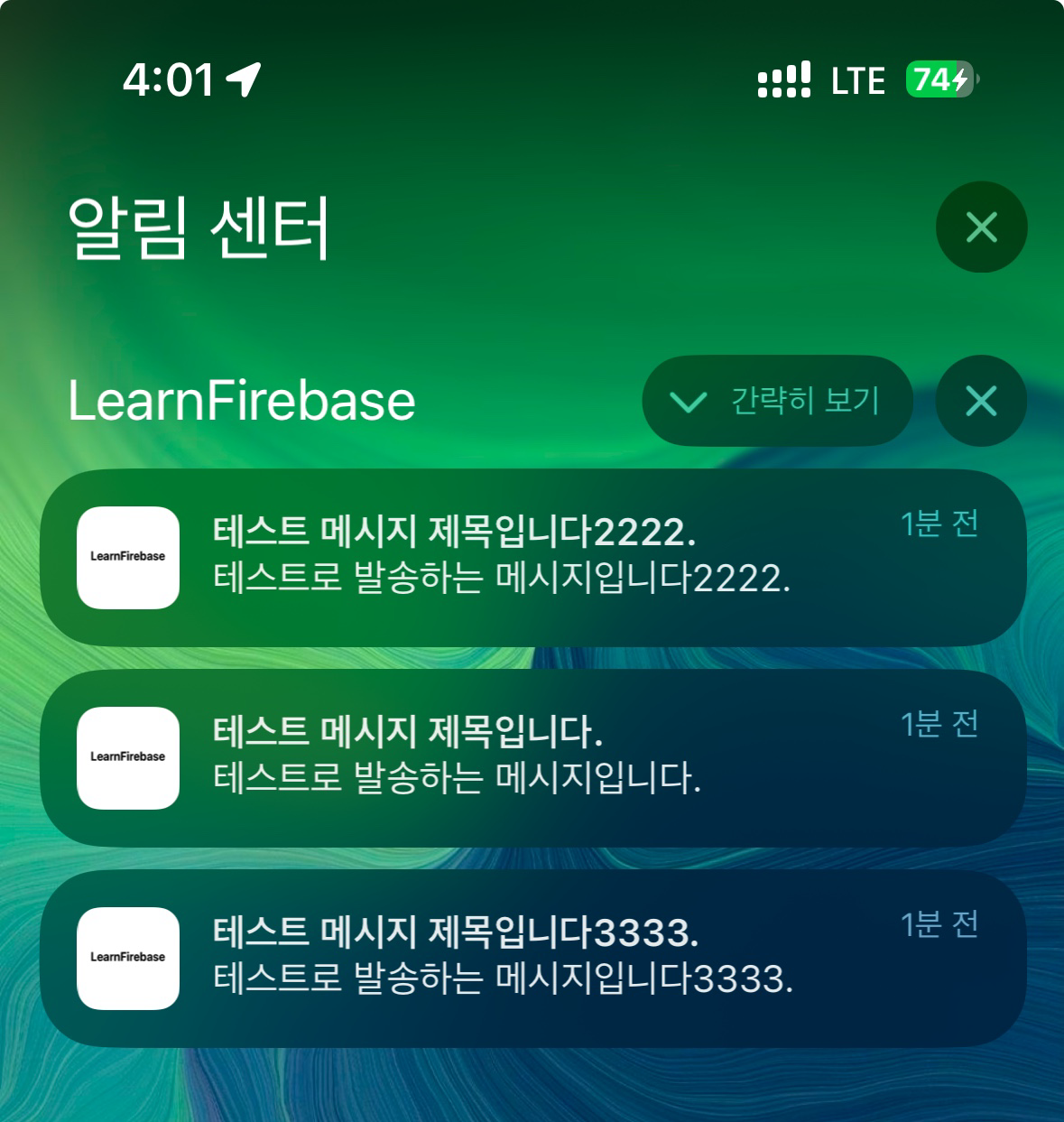 위와 같은 테스트코드로 기기에 설치한 앱에 푸시메시지가 정상적으로 들어오는 것을 확인하였다.