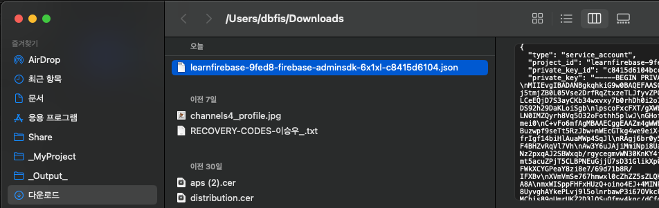 다운로드된 파일은 learnfirebase-9fed8-firebase-adminsdk-6x1xl-c8415d6104.json 이다.