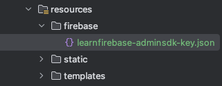 SpringBoot 프로젝트의 resources 디렉토리 아래에 firebase 라는 이름으로 디렉토리를 생성한 뒤에 이곳에 넣어주되, 파일의 이름은 learnfirebase-adminsdk-key.json 정도로 단순하게 변경해준다.