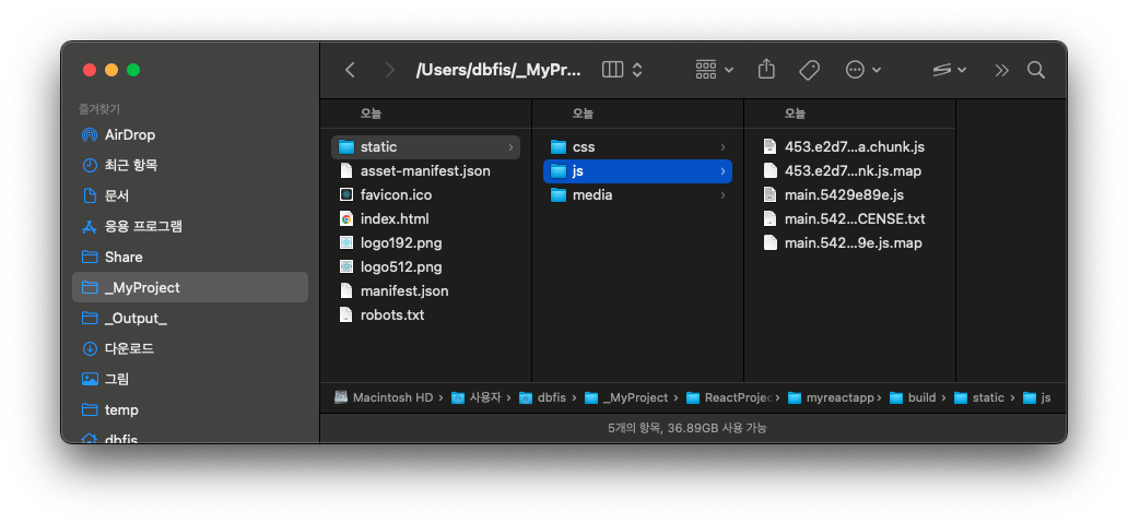 위 명령을 실행하고나면 React 앱 프로젝트 디렉토리에 build 디렉토리가 생성되고, 그 안에 파일들이 생성된 것을 볼 수가 있다.