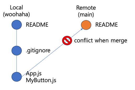 충돌이 발생한 이유는 remote 저장소의 README 파일과 local 에서 push 한 woohaha 브랜치의 README 파일의 내용이 달랐기 때문이다. 서로 다른 출발점에서 시작된 repository 이기 때문에 자동 merge 가 가능하지 않았다.