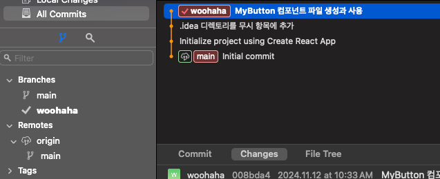 여기까지 수행하면 로컬의 woohaha 브랜치는 최초 main 브랜치로부터 기존 woohaha 브랜치에 수정한 커밋들이 차례대로 정렬된다.