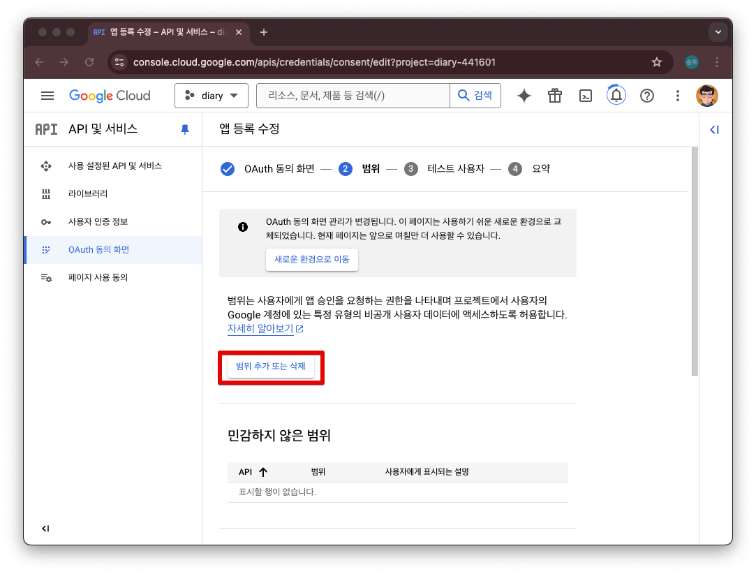 "OAuth 동의 화면" 구성의 2단계에서는 "범위"를 설정한다.