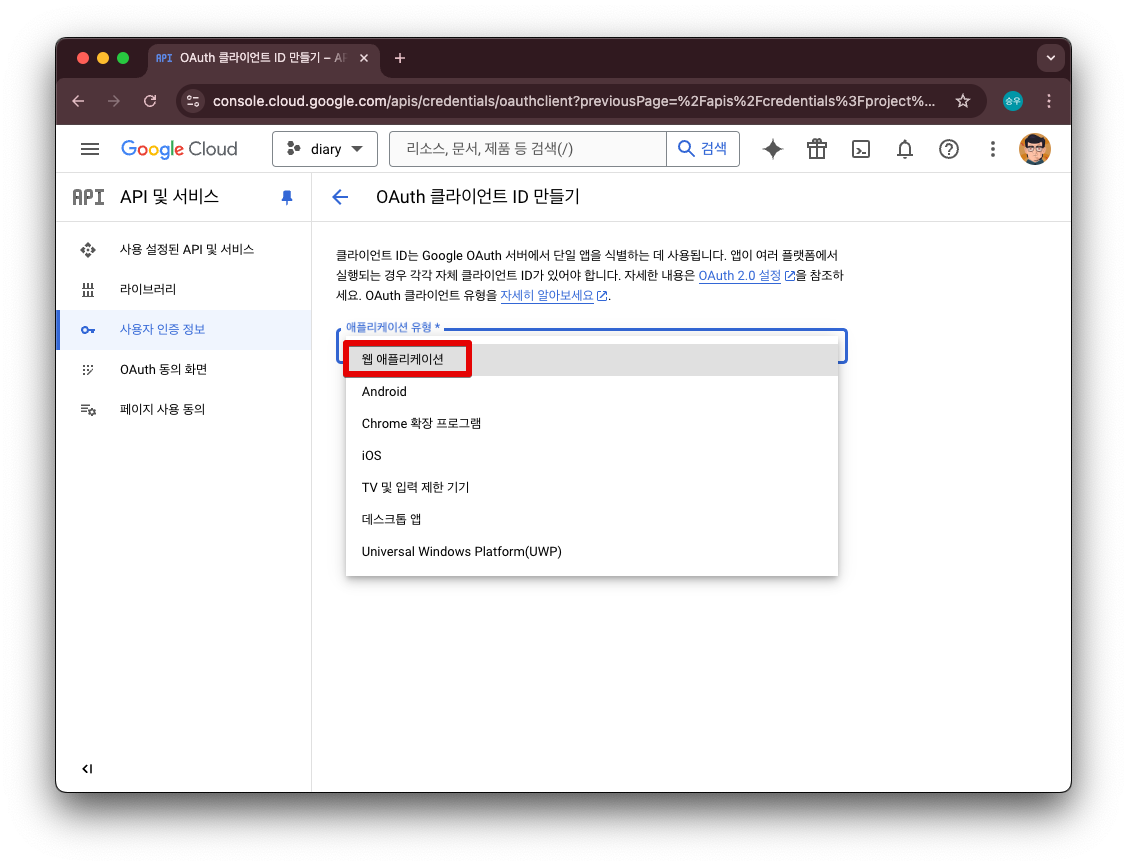 애플리케이션 유형 중에서 적절한 유형을 선택한다. 여기에서 테스트할 앱은 웹 애플리케이션이므로 "웹 애플리케이션"을 선택하였다.