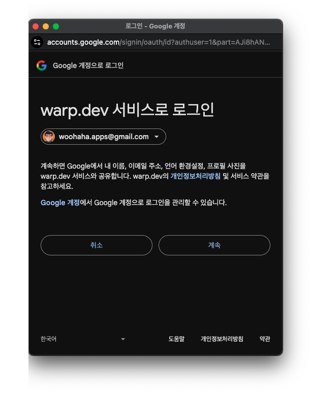 내가 로그인한 구글 계정이 표시되고 (만약 여러개라면 선택이 가능), 계속 버튼을 클릭하면 선택한 구글 계정으로 로그인해서 해당 웹사이트의 기능을 이용할 수 있게 된다.