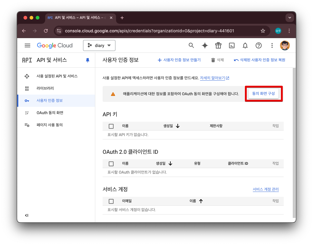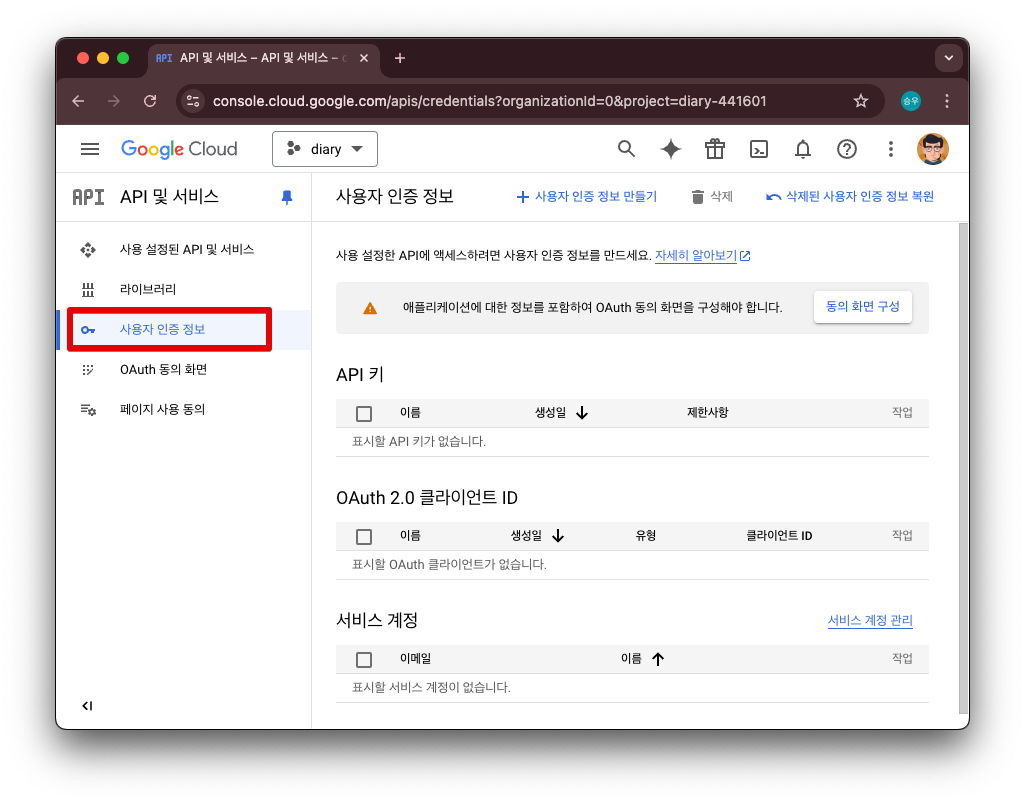 화면 왼쪽 위의 삼선을 클릭해서 "API 및 서비스" 아래의 "사용자 인증 정보" 를 선택해도 된다.