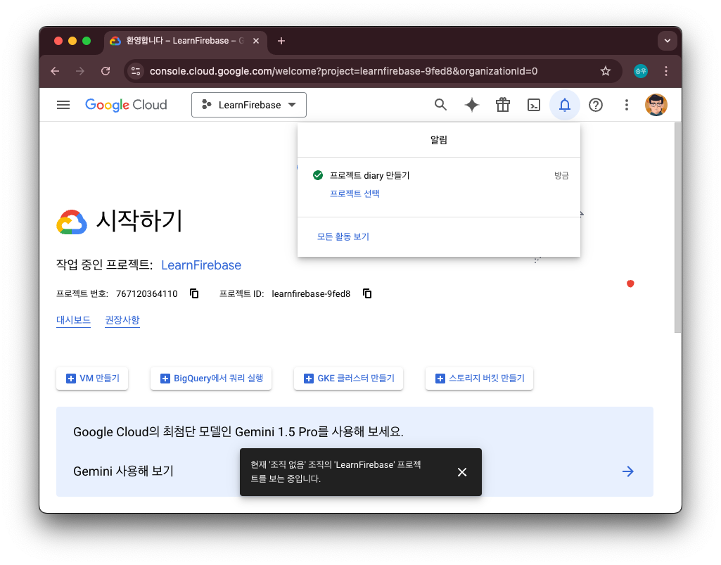 프로젝트 이름에 생성할 프로젝트의 이름을 입력한 뒤에 "만들기" 버튼을 클릭하면 프로젝트 만들기 과정이 진행되고 완료되었음이 표시된다.