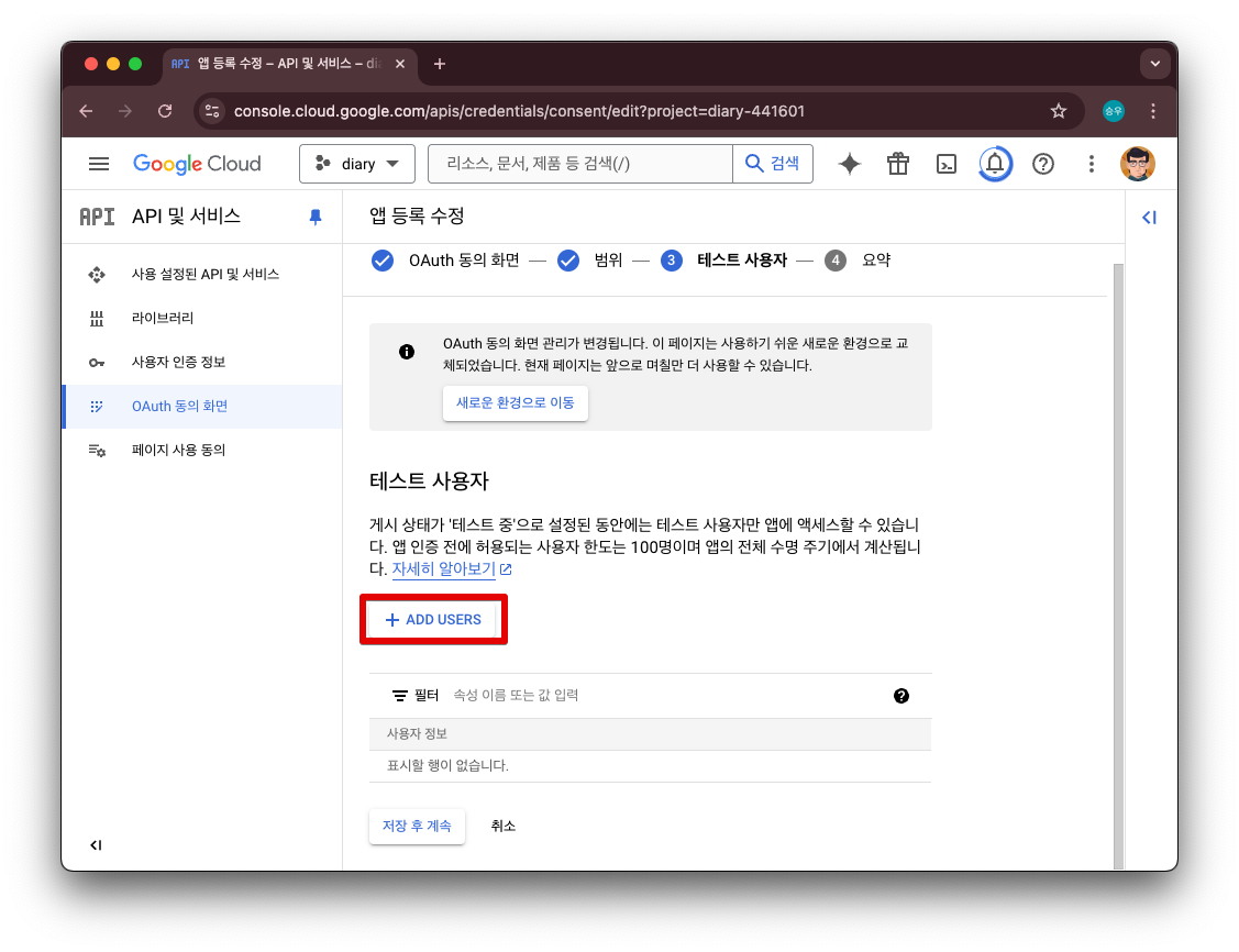 여기까지 OAuth 동의 화면의 구성 작업이 완료되었다.
