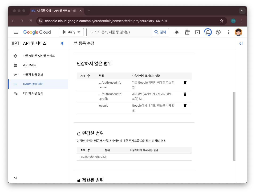 만약 3개 항목 이외에 다른 항목을 체크했다면, "민감한 범위" 목록에 해당하는 API 항목이 표시될 것이다.