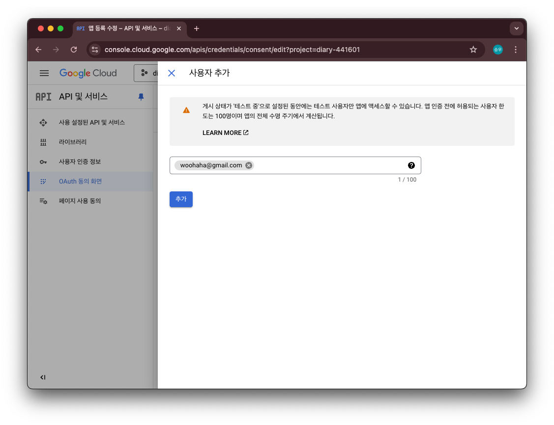 "ADD USERS" 버튼을 클릭해서 게시 상태가 '테스트 중' 으로 설정된 동안에 접근할 수 있는 구글 계정을 등록해준다.