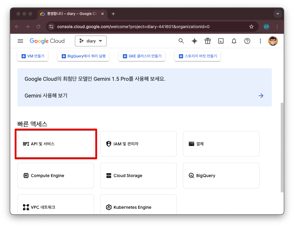 아래쪽으로 조금 스크롤해보면 "API 및 서비스" 버튼이 보인다.