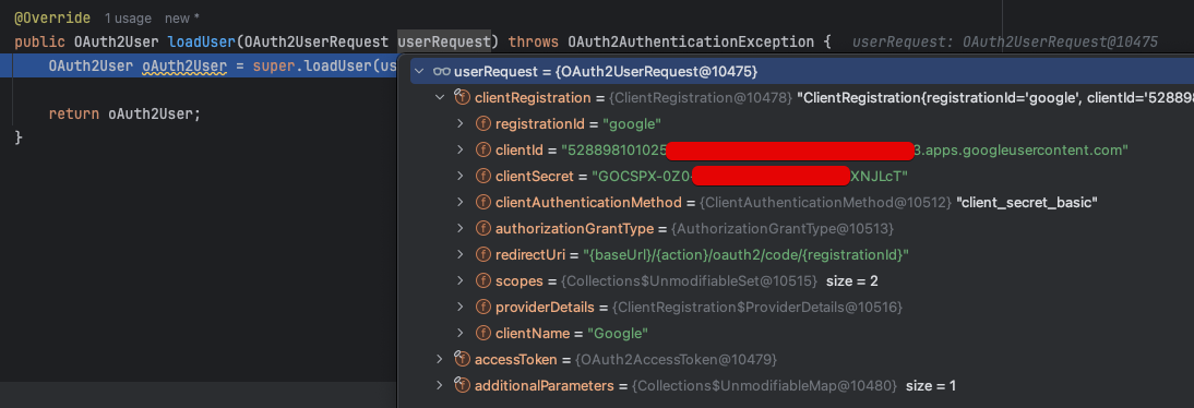 application.yml 에 google oauth2 관련 설정값을 추가한다. 이 설정값은 https://iwoohaha.tistory.com/318 포스트에서 확인할 수 있는 Client ID 와 Client 비밀키 값 등이다. 주의할 것은 맨 마지막 openid 항목은 추가하지 않는다는 것이다.
