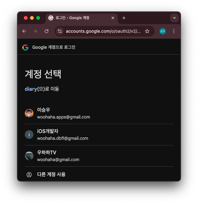 맨 아래에 추가한 "Sign in with Google" 버튼을 클릭하면 로그인한 Google 계정 목록을 보여주는 화면으로 이동된다.