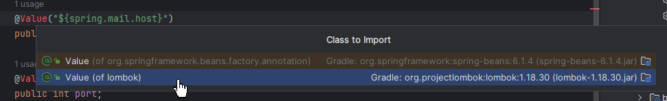 위 클래스를 작성하다가 실수한게 있었는데, @Value 애노테이션을 사용하기 위해서 import 한 패키지명이야. 아무생각없이 앞에 나온 lombok 을 선택했었는데…
