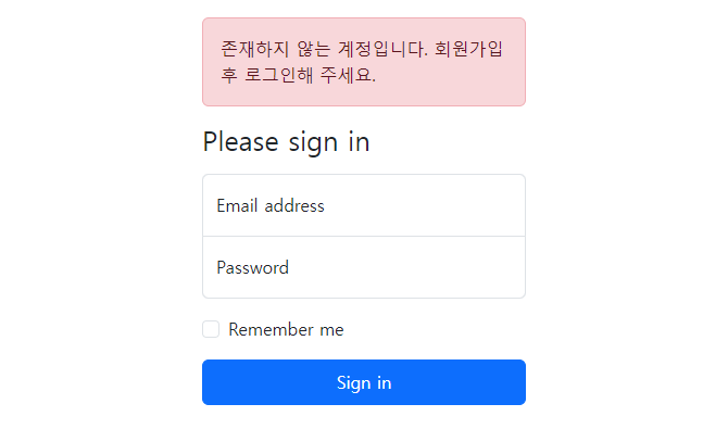 멤버로 등록되지 않은 woohahaha@gmail.com 을 입력했을 때나 존재하지 않는 계정의 비밀번호를 일부러 틀리게 입력해서 로그인했을 때모두 아래와 같이 BadCredentialsException 예외시의 메시지가 표시되더라고.