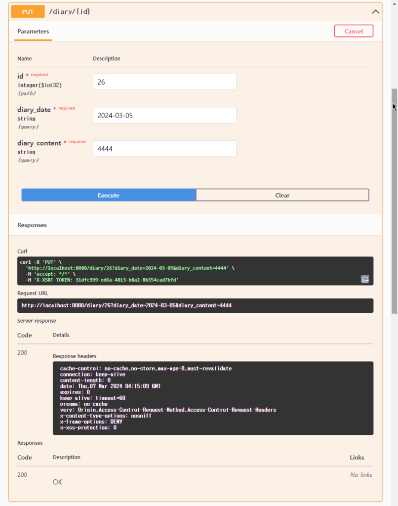 Spring Boot: study.diary swagger 연동 (API 테스트 목적) 에서 swagger UI 에서 테스트시 문제가 되었던 PUT method 에 의한 /diary/{id} API 호출 역시 문제없이 실행되는걸 확인할 수 있게 되었지.