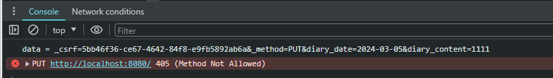 프로그램을 빌드해서 실행시키면 서버로그와 클라이언트 로그에 각각 Request method ‘PUT’ is not supported 와 405 (Method Not Allowed) 가 남아.