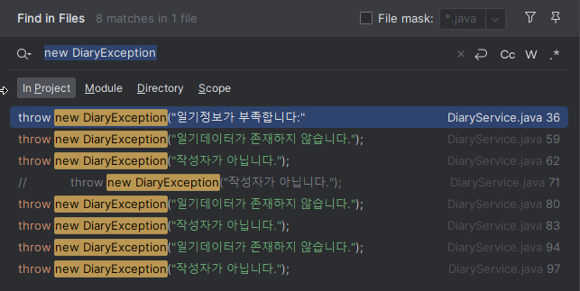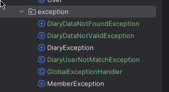 기존에 DiaryException 으로만 예외를 생성시킨 코드를 찾아서 유형에 따라 새로 추가한 예외클래스를 사용하는 코드로 변경을 했어.