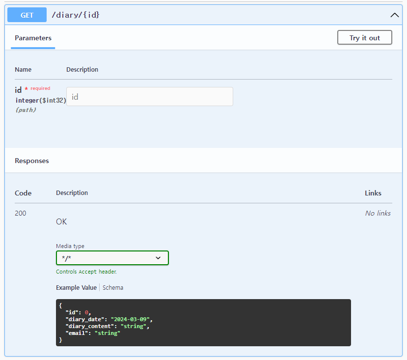Diary 객체를 리턴하는 GetDiary 함수의 경우 swagger 에는 이렇게 표시가 되고 있어.