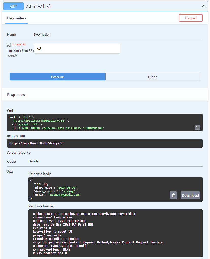 swagger UI 를 이용해서 테스트해본 결과 200 응답코드와 함께 Diary 객체정보가 json 형식으로 내려온 걸 확인할 수가 있어.